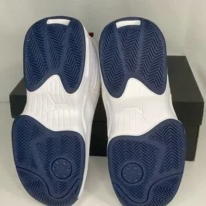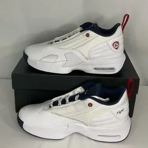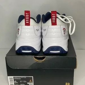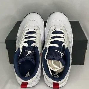 Sleek Jordan Max Aura 2 sneakers in white and navy. Features classic design with red highlights. These are size 6y.