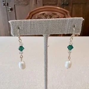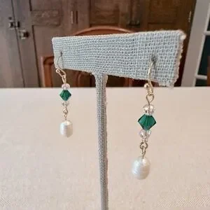 Handmade Pink & Green Crystal Freshwater Pearl Dainty Dangle Earrings Gold Tone