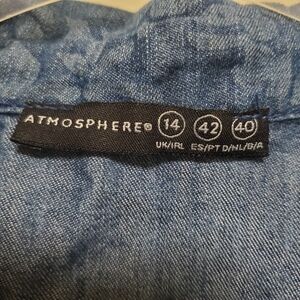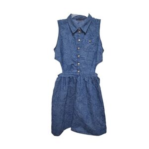Lightweight denim dress by Apostrophe. Floral like burnout print. Both sides/hips are cut out/ open. Back waist is gathered elastic, stretches to your fit. Button front and collar. Button chest pocket. Adorable! Dress it up or down, wear all year!
