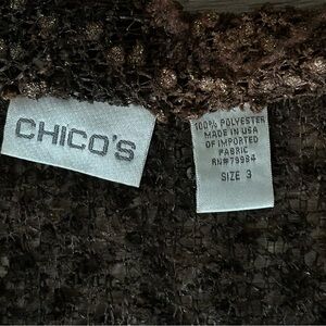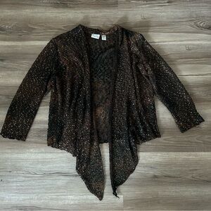 CHICO’S Brown Tie Dye Gold 3/4 Sleeve Front Tie Net Cardigan Women Size 3 In good condition / has stretch / lettuce trim hems / Front tie/ Gold speckle throughout / see through like crochets netting