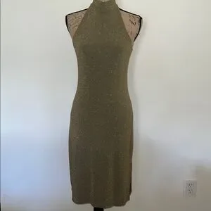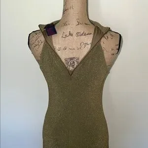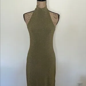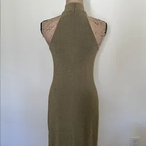 Elegant olive green dress with shimmering details. Perfect for evening events. With the holidays around the corner, this dress is a definite statement piece. High neck line with bra lining on the inside zipper closure side slit along the knee.