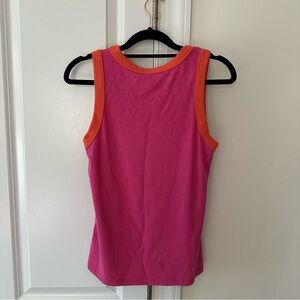 Vibrant pink tank top with bold orange trim. Sleeveless design. Perfect for casual wear.