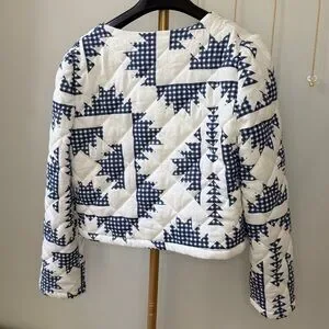 NWT CAROLINE CONSTAS White/Blue Quilted Jacket Linen Blend Puffy Shoulder $395