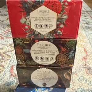 Set of three Predire concentrate soaps. Includes Apple & Grape, Vitamin C & E, and Anti-Aging Gold. Vibrant packaging with red, green, and black accents.
