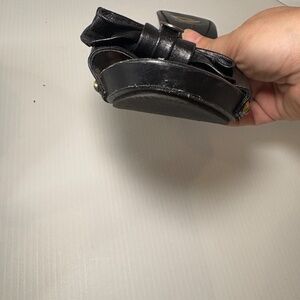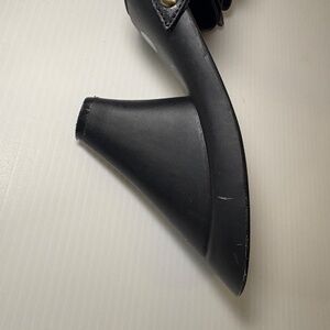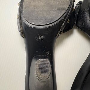 This product is a vintage pair of G by Guess open toe mule heels in size 7.5M. The shoes feature a slip-on closure, black color, and mid heel height with gold accents and a leather bow detail. These stylish heels are perfect for various occasions such as parties, cocktails, business meetings, or formal events. The retro style with a touch of biker and punk influences makes them a unique and eye-catching addition to any outfit. Made from synthetic and leather materials, these versatile shoes can add a touch of glam to your wardrobe for any season.