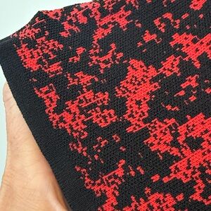 Elegant, with stretch, short-sleeve dress with a striking red and black pattern. Perfect for evening wear.
