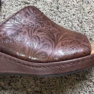 b.o.c Stylish brown embossed slide wedge sandals. Perfect for casual wear. Sz 9M. Good condition except one small flaw, see pics.