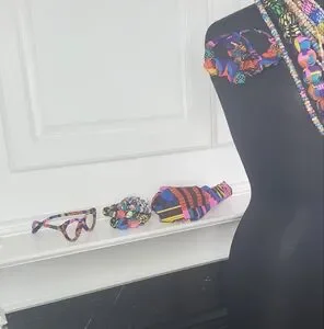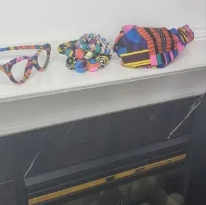 Vibrant and stylish, this beaded necklace set features a mix of pink, blue, and yellow beads. Perfect for adding a pop of color to any outfit. Includes head wrap, stacked bracelets, eye glasses frames, and earrings. Brand new!