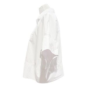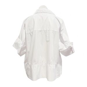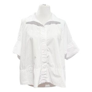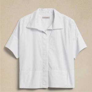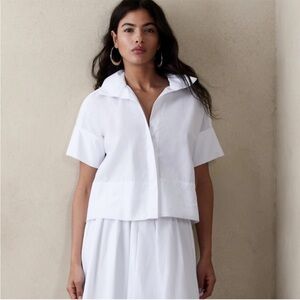 Airy with a classically tailored aesthetic, this beautiful top uses sumptuous cotton cut in a flowy silhouette with a hidden placket for more uniform style. Elegant white shirt from Banana Republic. Versatile and timeless style.
