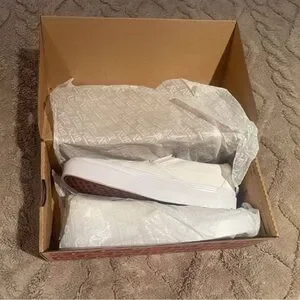 Sleek white Vans slip-ons. Timeless design with a comfortable fit. Size 5.5 women’s brand new, with box! 🤍