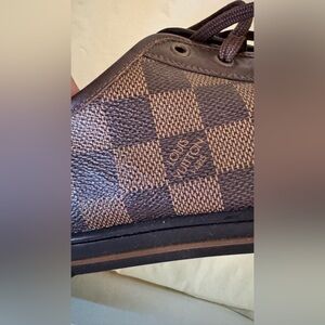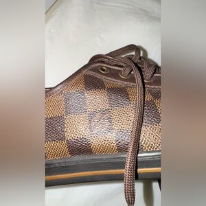 Authentic Louis Vuitton sneakers featuring the signature Damier Ebene checkered pattern in brown coated canvas with leather trim and brass eyelets. Timeless, understated luxury that pairs effortlessly with casual or dressy fits.