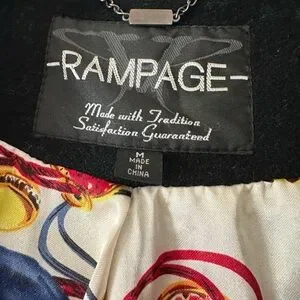 Chic black trench coat by Rampage. Features a classic design with button closure. Ideal for versatile styling. 80% wool blend