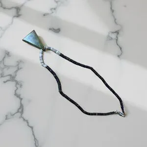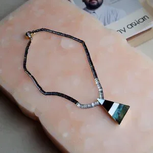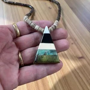 Hand-cut shell heishi strand with a graphic inlay tab pendant (white shell, black jet/onyx, cream shell, turquoise, green serpentine/green jasper). Classic Kewa/Santo Domingo aesthetic; clean triangular geometry; great everyday piece.