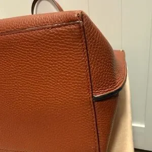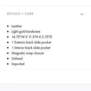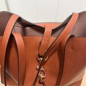 Cute Brown ( Acorn) Tote. Light Gold hardware. 16.75" W 11.5" H and 5.75" D. 1 exterior back slide pocket and one interior slide pocket. Magnetic snap closure. Very roomy fits a lot of stuff. Has some wear on the bottom 4 corners, besides that in very good condition. It is a great bag but I have it in 3 other colors too so time to get rid of one to make room in my closet. Comes with original dust bag.