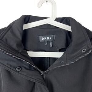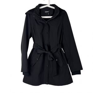 Sophisticated DKNY black softshell trench coat in women’s size Medium. Features a flattering belted waist, removable hood, and sleek minimalist design. Perfect for layering in cooler weather, whether for work, casual outings, or city style.