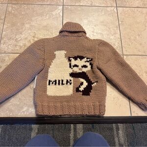 Charming and rare mid-century hand-knit Cowichan-style wool sweater featuring an adorable kitten and milk bottle motif on the back and a matching design on the front. This piece captures the playful side of vintage Canadian knitwear — thick, warm, and beautifully made.