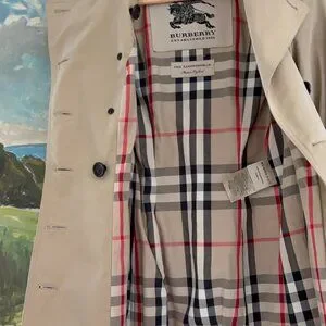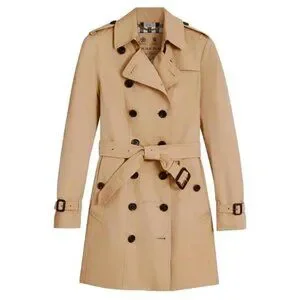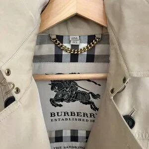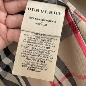 Iconic Burberry trench coat crafted in England from 100% cotton gabardine with the brand’s signature check lining. This is the Sandringham silhouette — the tailored “medium” fit known for its structured waist and flattering drape. Features a double-breasted front, epaulettes, storm flap, belted cuffs, and removable waist belt. Classic and timeless, this coat defines understated British luxury. Fully lined with Burberry’s signature House Check interior and gold-tone chain neck detail.