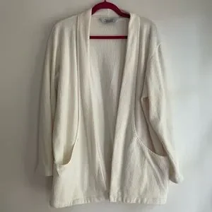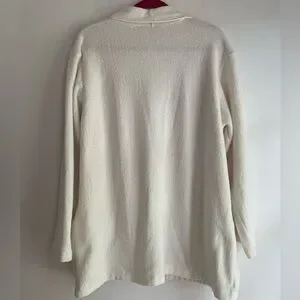Soft off-white fleece jacket. Open front, with shawl collar and two deep front pockets. Very cozy, great condition.