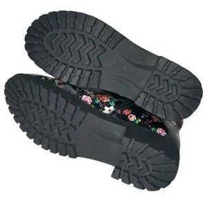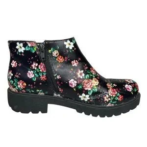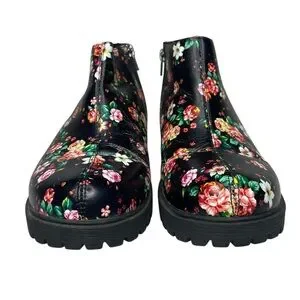 Alegria 39 Shayne Blossom black floral leather boots. Ankle zip, lug soles.