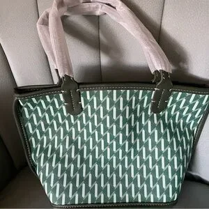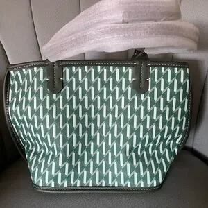 Stylish green and white tote bag with a geometric pattern. Features sturdy handles. 10x8