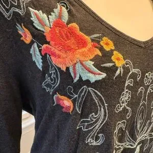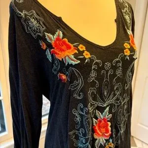 Charcoal grey tunic with pink, yellow, and turquoise floral embroidery.