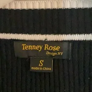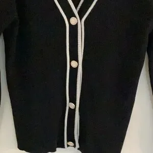 Stylish black ribbed knit cardigan featuring white trim and buttons from Tenney Rose. Perfect for layering. It’s in a size S with measurements of about 14” from pit to pit lying flat, about 22” in the length and about 21.5” in the sleeve length. The fabric is 67% rayon and 33% polyester. This cardigan is in good condition.