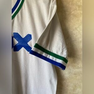 Interesting vintage sportswear tee, likely from the 70s or 80s. Not totally sure what the logo is or what team it would associate with, likely a small local league. No major holes but staining is present. Great for the true vintage lovers.