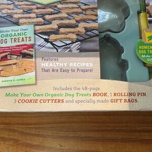 Create delicious organic dog treats with this book and kit. Includes recipe book, cookie cutters, rolling pin and gift bags. Perfect for pet lovers and great gift. New