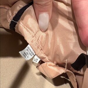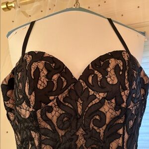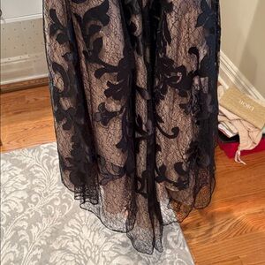 This stunning dress features a beautiful black lace overlay on a cream background, perfect for any special occasion. Its elegant design and flattering fit make it a must-have addition to your wardrobe.