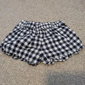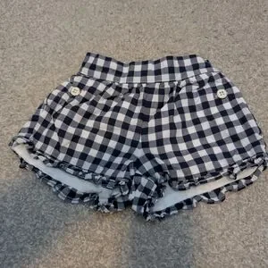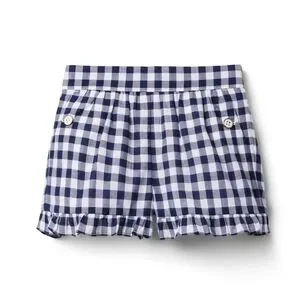 Chic blue gingham shorts with ruffle hem. High waist design. Ideal for casual wear.