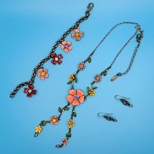 Step into timeless elegance with this excellent pre-loved condition vintage-inspired flower design jewelry set, a celebration of color, charm, and craftsmanship. Each piece blooms with intricate floral motifs, delicately arranged in a palette of soft pastels and rich jewel tones—emerald greens, ruby reds, sapphire blues, and accents that shimmer with old-world allure.