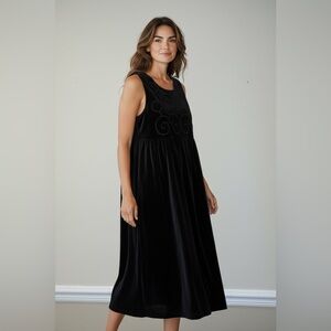 Elegant black velvet dress with intricate swirl design. Perfect for formal occasions.