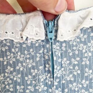 Features: This is a stunning one of a kind vintage prairie dress in amazing condition. Light blue all over floral pattern fabric. Vintage talon zipper closer. Square neckline and short sleeves with lace trim. Accent lace trim on the bodice. Gathered billowy skirt. Long maxi length. Drop waist.