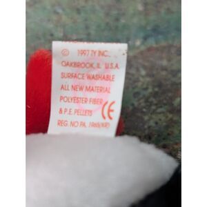 TY Beanie Baby Puffer™ (1997) with mint hang and tush tags. Features bold black, white, and red plush with a bright yellow-and-red beak and red feet. A standout piece for bird lovers and vintage collectors.