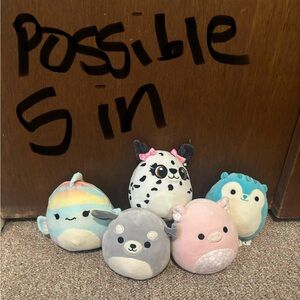 Contains one 8 inch squishmallow, one 5 inch squishmallow, and a mystery plush that could be a random plushie or another squishmallow!!