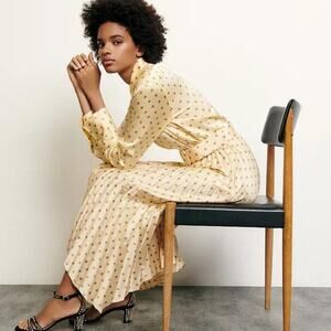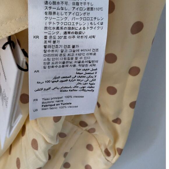 This is a beautiful Sandro Paris Peany shirt in polka-dot print. Yellow, button-down. Silky satin material, 100 % viscose. Mother-of-pearl buttons. Sandro size 4, which according to their size chart is US size 10. New with tags.
