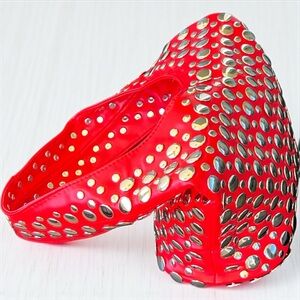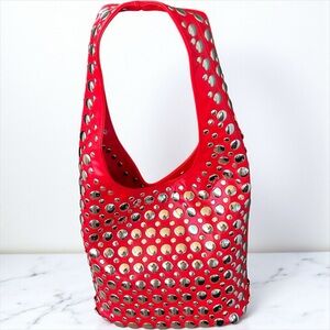 Vibrant red shoulder bag with metallic studs. This bag is decorated with rivets and is made of high quality PU leather with magnetic closure. Stylish and bold design.