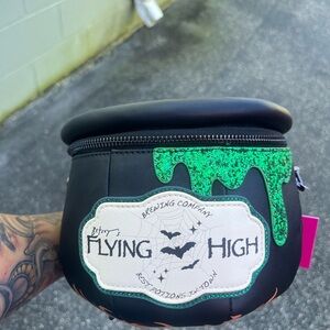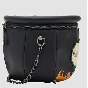 Stylish black crossbody bag with vibrant green glitter and orange flame accents. Unique cauldron design. Perfect for a bold statement.