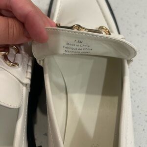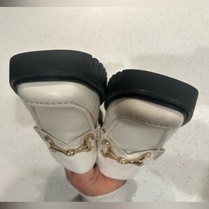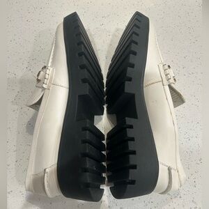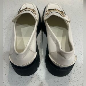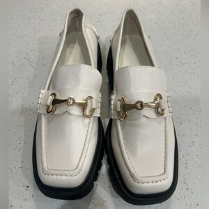 They are a glossy, white loafer with a chunky black lugged platform sole and a gold-colored metallic bit detail. The heel is approximately 1 3/4" with a 1" platform. The loafers are described as having a synthetic upper and lining