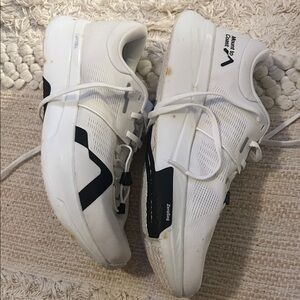 Sleek white running shoes with black accents. Perfect for athletic activities. Pre owned good condition (it shows rust stains in the sole and some on the side) washed but stains did not come out. But the shoes are used once. Size 9