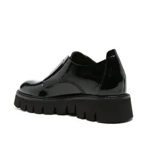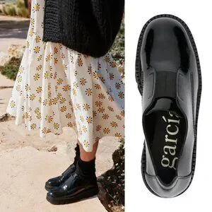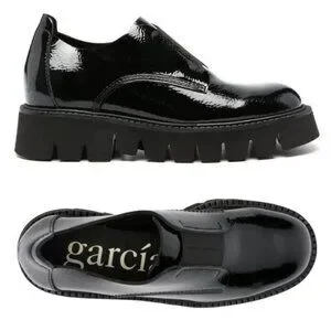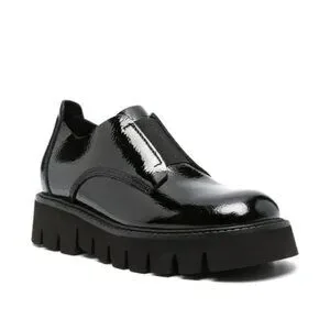 These Silvia loafers by Pedro Garcia feature a paneled design, branded leather footbed, chunky rubber lug sole, and a round toe. They are crafted in calf leather with a patent finish. These slip-on style shoes have an elasticated front panel.