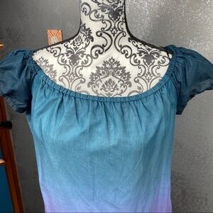 Theory gorgeous blue and purple dip dye mini dress. The color is truly pretty. Elastic at neckline. Could be worn off shoulder. Fully lined. 100% cotton. Lightweight and perfect for a casual summer day. Size medium.