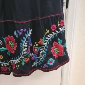 Vintage Johnny Was Los Angeles Summer dress with full skirt. Colorful neckline and hem embroidery. Excellent pre-owned condition, no flaws or holes. Smoke-free home, all clothing items laundered or dry-cleaned prior to shipping.