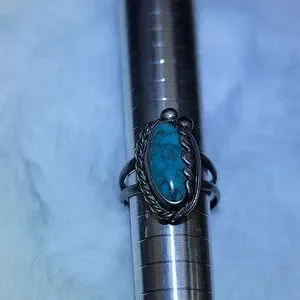 Elegant vintage turquoise ring, set in a sterling silver band. Silver was acid tested to confirm. A very nice and dainty women's size 7 ring. Being sold as found with all the original patina. No makers mark or silver stamp present. No cracks to silver or chips to turquoise. 5 grams.