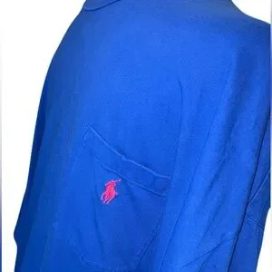 Here’s a great wardrobe staple or gift for the larger well dressed gentleman. Stylish cobalt blue short sleeve shirt features the iconic Polo logo in bright red on the chest. Wear it alone or under a flannel for your winter wardrobe. Very nice owned condition with no issues from a smoke free home.