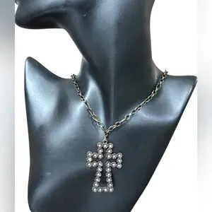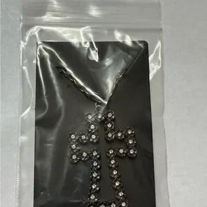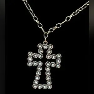 This stunning cross pendant necklace is adorned with sparkling stones, perfect for adding a touch of elegance to any outfit.