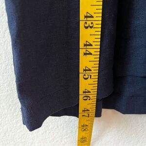 This gorgeous navy shirt dress by European brand ADEPTT, known for their timeless and sustainable styles, is made from 100% linen—perfect for warm weather and effortless style. Features a flattering collared neckline (a shirt-style with no buttons), rolled cuff short sleeves, and a relaxed empire waist (babydoll) that flows into a soft, airy skirt. The silhouette drapes beautifully with a subtle hi-lo hem, and...yes, it has pockets!