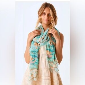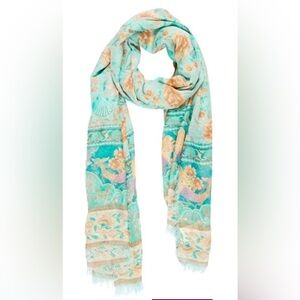 Elegant Spell scarf with seashell and mermaid patterns in sea foam green. Large and lightweight . Soft fabric. Perfect for any occasion.