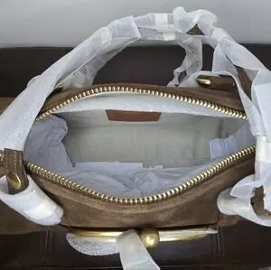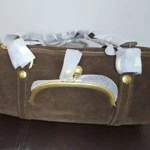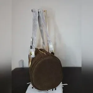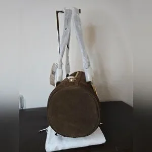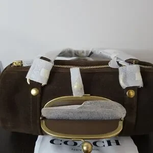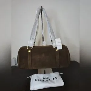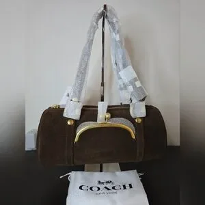 Limited edition Coach Kisslock Barrel bag in the color chocolate. Made of suede and full grain leather. Fabric lined. Kisslock pocket on outside and snap pocket inside. Only 60 of these bags made. New with tags. Comes with dust bag. Length 13.25in, height 6in, and width 6in. Handle has 10in drop.