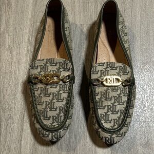 Stylish loafers with signature RL pattern. Features green trim and gold accents. Perfect for casual elegance.